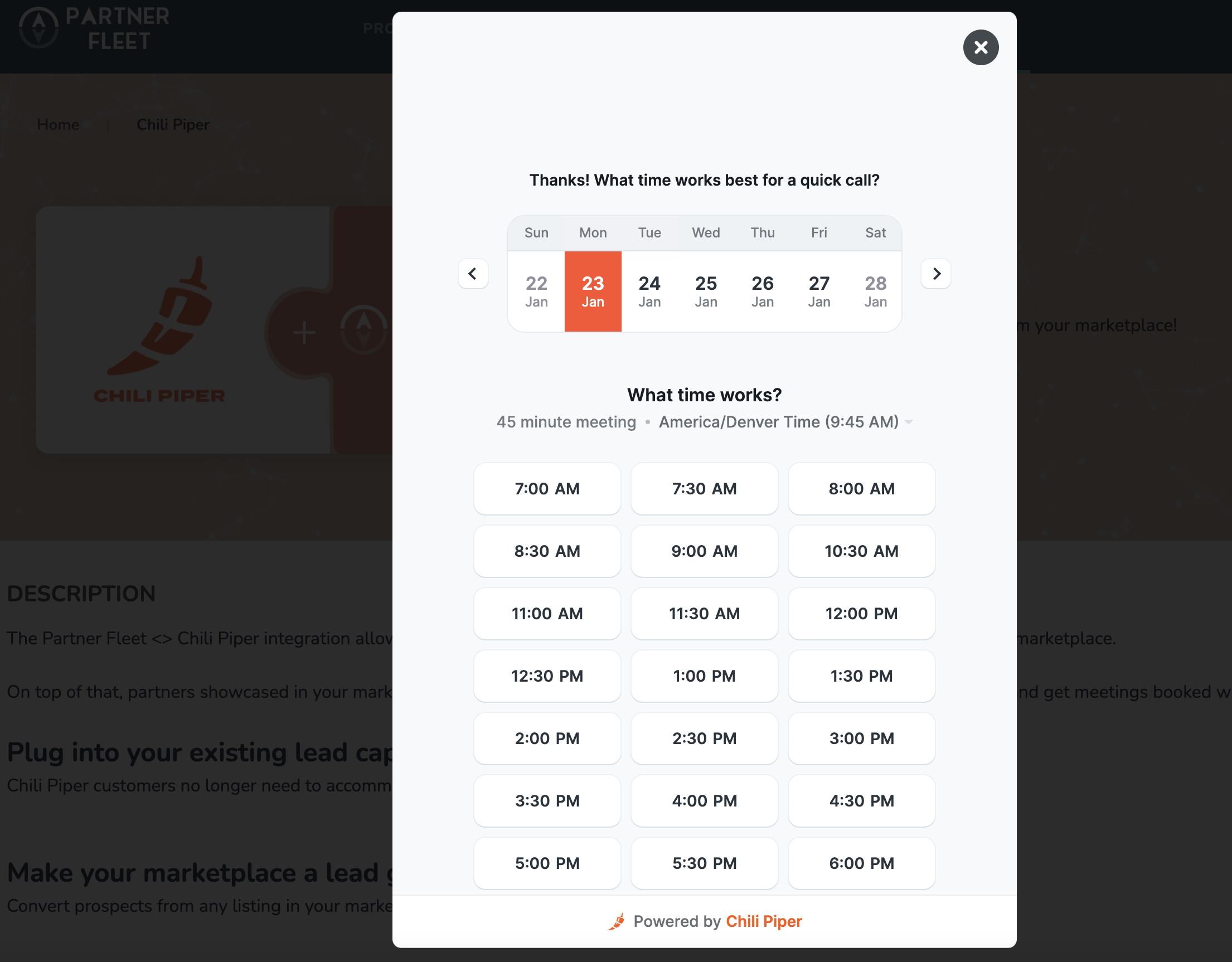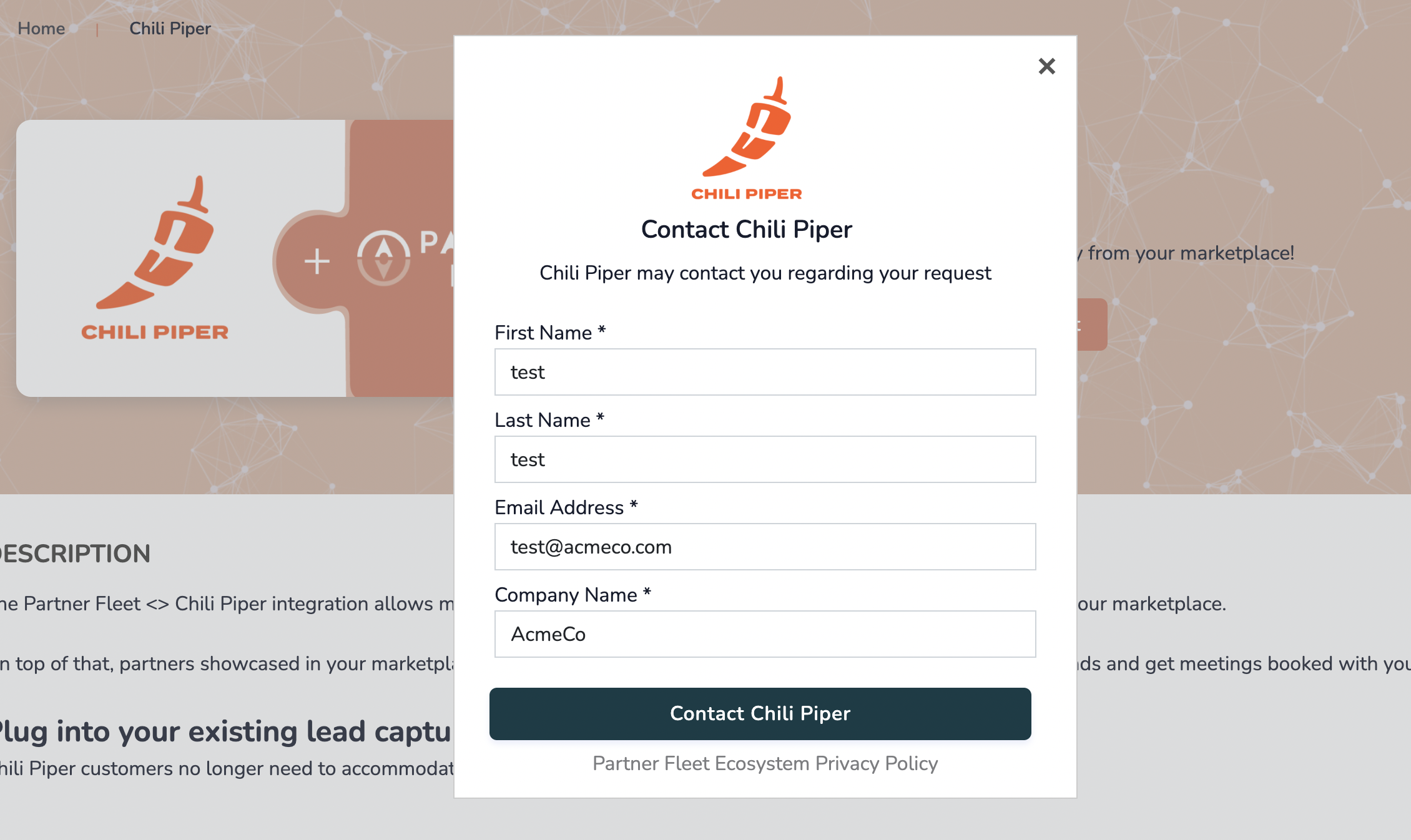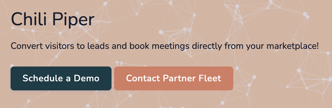 The Partner Fleet <> Chili Piper integration empowers you to convert leads directly from any partner listing on your marketplace. Set up is simple: connect your Partner Fleet account and let Chili Piper automatically capture, qualify, and route leads in real time.