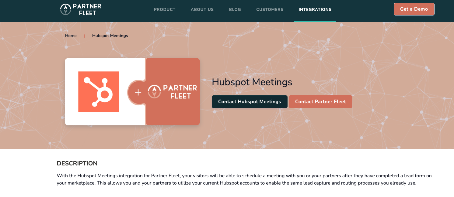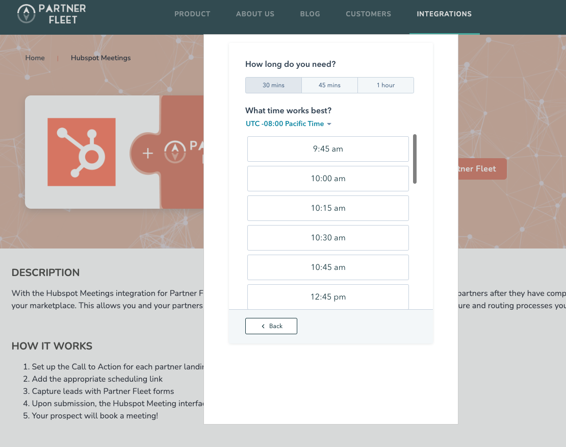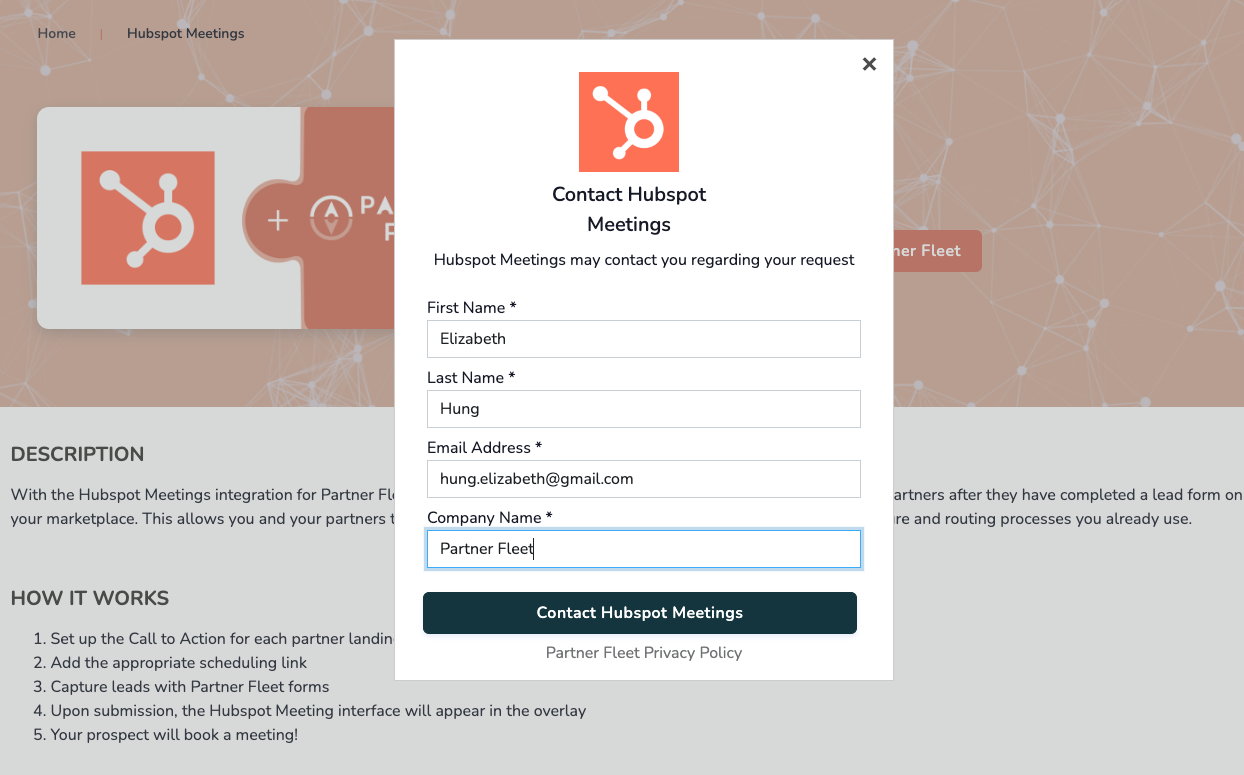 With the Hubspot Meetings integration for Partner Fleet, your visitors will be able to schedule a meeting with you or your partners after they have completed a lead form on your marketplace. This allows you and your partners to utilize your current Hubspot accounts to enable the same lead capture and routing processes you already use.
