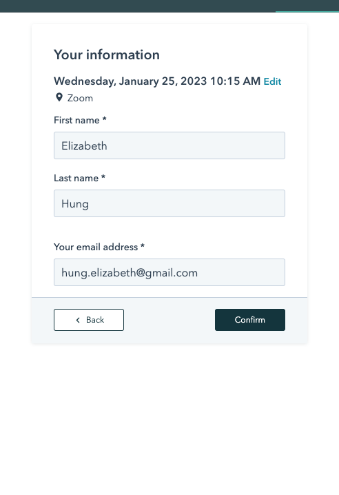 - Upon submission, the Hubspot Meeting interface will appear in the overlay